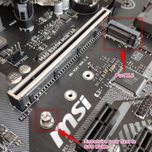 Il est important de mettre ce SSD M.2 avant l'installation de la carte graphique car celle-ci surmonte souvent l'emplacement du SSD. Dans tous les cas, aucune connectique supplémentaire n'est nécessaire, les disques M.2 soont auto alimenté et directement relié au port SATA ou au port PCIe de la cate mère.