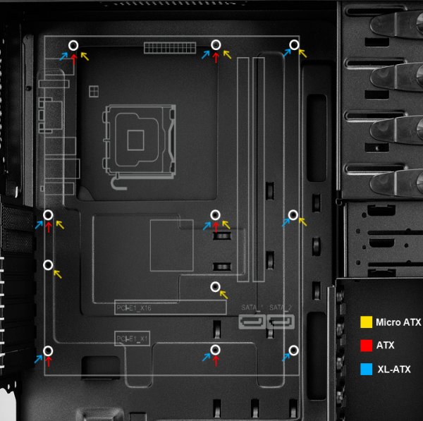 Installez maintenant les plots (entretoises) qui vont permettre la fixation de la carte mère dans le boîtier. Ces plots servent à éloigner la carte de la tôle, de façon à éviter les courts-circuits. Les plots sont au nombre de six ou neuf, et se positionnent différemment selon les cartes. Commencez par repérer où se trouvent les trous sur votre carte avant d'installer les plots dans le boîtier. Vous pouvez aussi approcher la carte pour trouver les trous qui correspondent. Une erreur de positionnement pourrait entrainer un court-circuit (souvent sans réel danger mais nous risquerions de chercher longtemps pourquoi le PC ne démarre pas). De même, il ne faut pas installer plus d'entretoises qu'il existe de trous dans la carte mère.